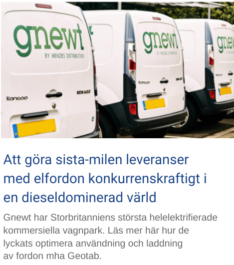 Övergå till el med GEOTAB EVSA (bedömning av mest lämpliga elfordon) och analysera data från era fossila fordon för att få rekommendationer om vilka fordon som kan bytas ut mot elfordon idag. Analys baseras utifrån TCO kostnad, räckviddsbehov och minskade CO2 utsläpp.