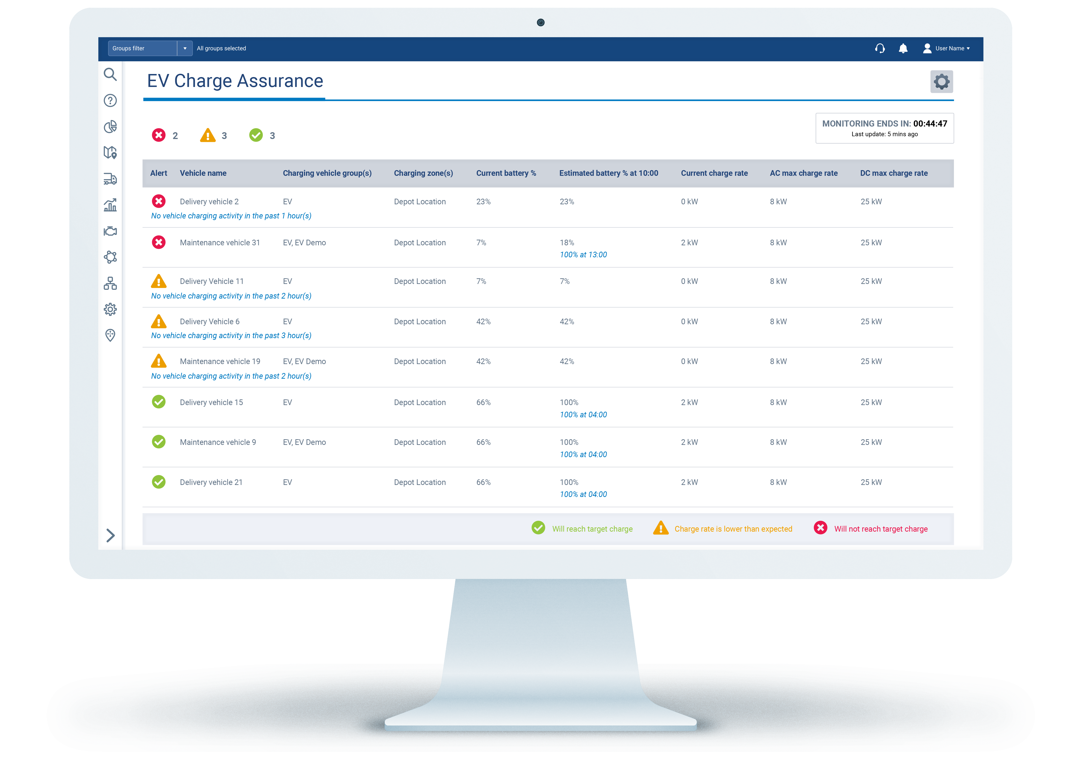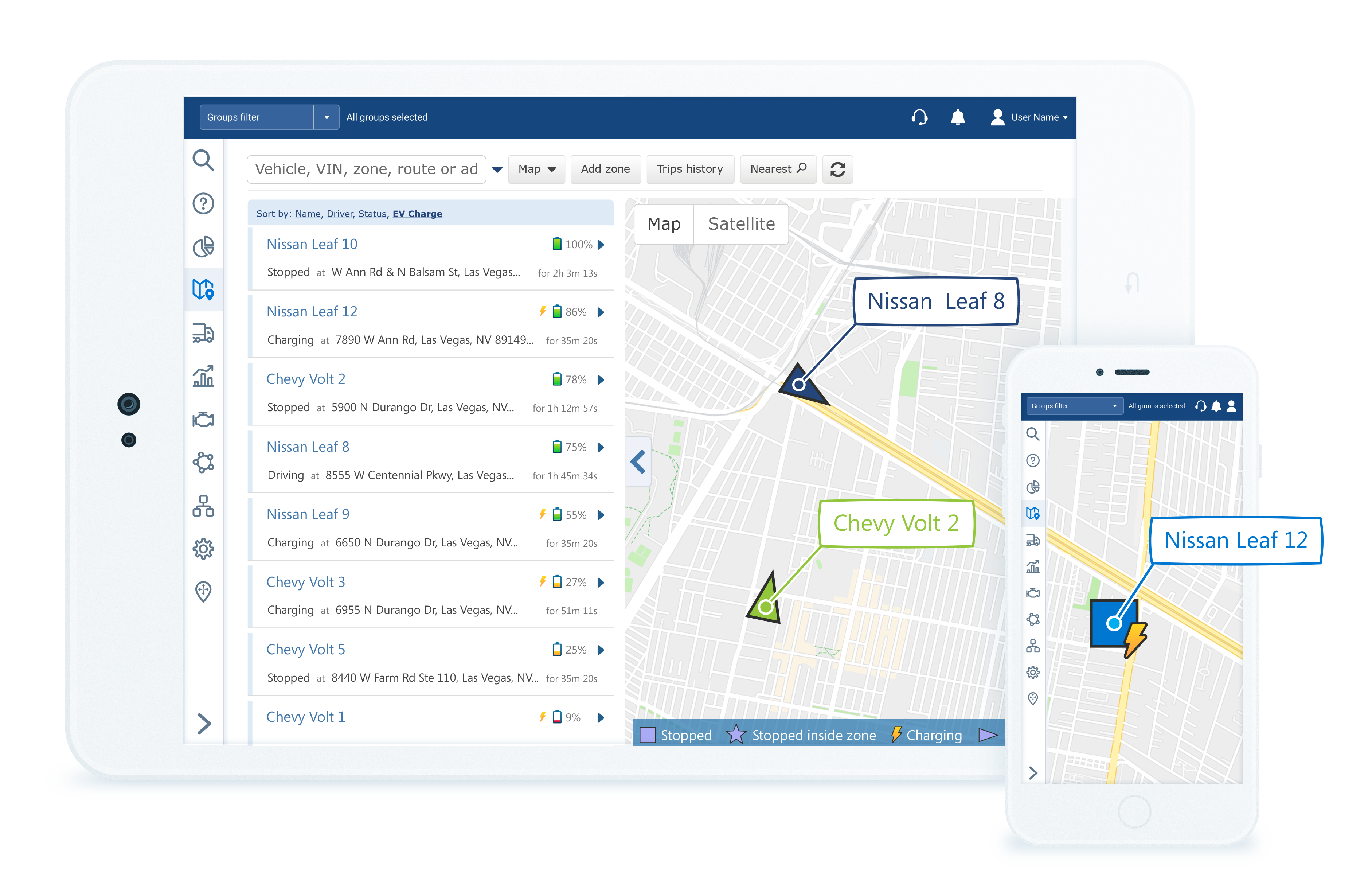 Övervaka batterinivå (SoC), kWh förbrukning, bränsleförbrukning och undvik kostsamma stopp genom att sätta upp varningar vid för låga nivåer, t.ex för låg batterinivå vid ankomst till en laddzon. Efterlev nya CSRD kravet med faktisk bränsleförbrukning.